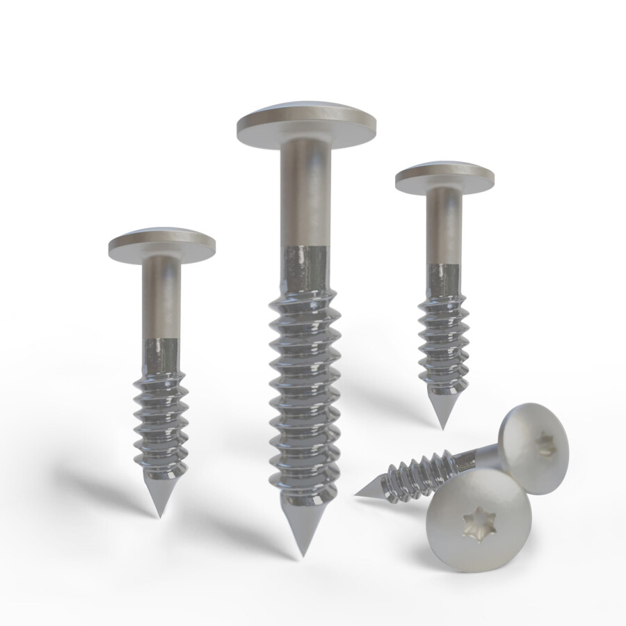 HPL-Fassadenplattenschrauben, speziell für die Montage von Trespa- und HPL-Platten. Die Schrauben bestehen aus Edelstahl (A4 AISI 316 / EN 1.4401) und sind mit einer speziellen Beschichtung versehen. Dadurch sind sie korrosionsbeständig, UV-beständig und kratzfest. Der Schraubenkopf ist farblich auf die Platte abgestimmt und hat einen Durchmesser von 12 Millimetern.