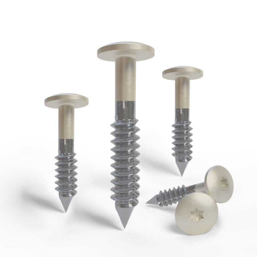HPL-Fassadenplattenschrauben, speziell für die Montage von Trespa- und HPL-Platten. Die Schrauben bestehen aus Edelstahl (A4 AISI 316 / EN 1.4401) und sind mit einer speziellen Beschichtung versehen. Dadurch sind sie korrosionsbeständig, UV-beständig und kratzfest. Der Schraubenkopf ist farblich auf die Platte abgestimmt und hat einen Durchmesser von 12 Millimetern.