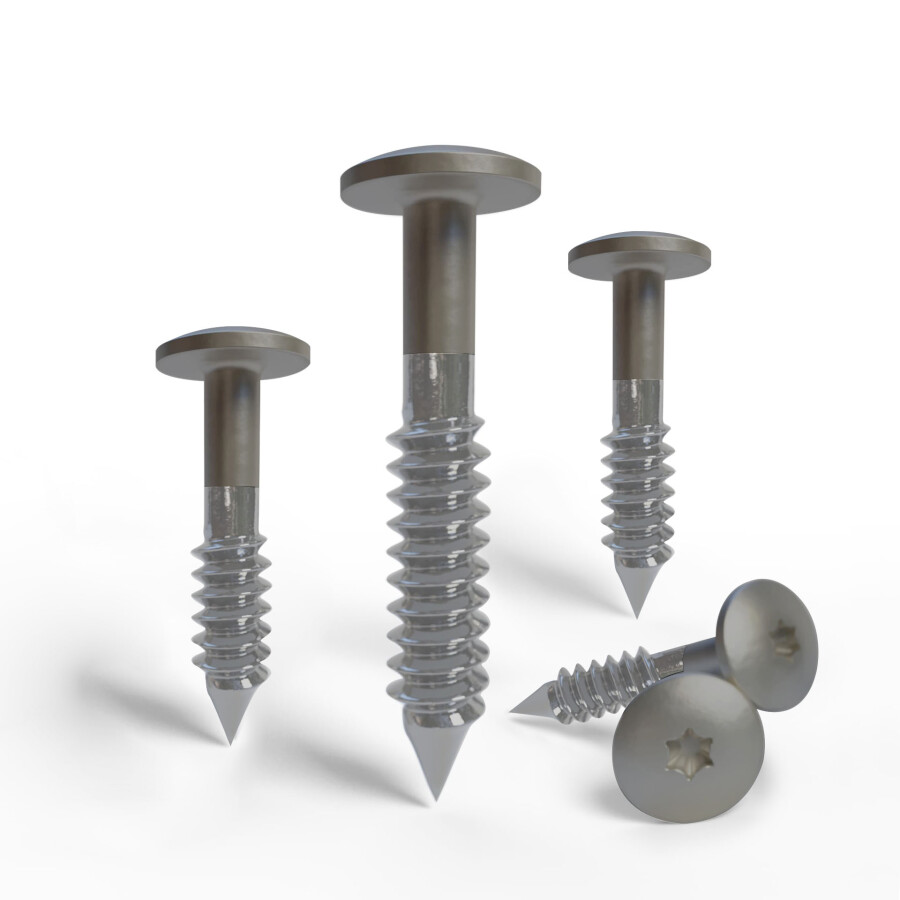HPL-Fassadenplattenschrauben, speziell für die Montage von Trespa- und HPL-Platten. Die Schrauben bestehen aus Edelstahl (A4 AISI 316 / EN 1.4401) und sind mit einer speziellen Beschichtung versehen. Dadurch sind sie korrosionsbeständig, UV-beständig und kratzfest. Der Schraubenkopf ist farblich auf die Platte abgestimmt und hat einen Durchmesser von 12 Millimetern.