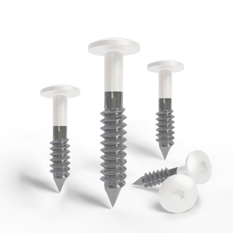 HPL-Fassadenplattenschrauben, speziell für die Montage von Trespa- und HPL-Platten. Die Schrauben bestehen aus Edelstahl (A4 AISI 316 / EN 1.4401) und sind mit einer speziellen Beschichtung versehen. Dadurch sind sie korrosionsbeständig, UV-beständig und kratzfest. Der Schraubenkopf ist farblich auf die Platte abgestimmt und hat einen Durchmesser von 12 Millimetern.