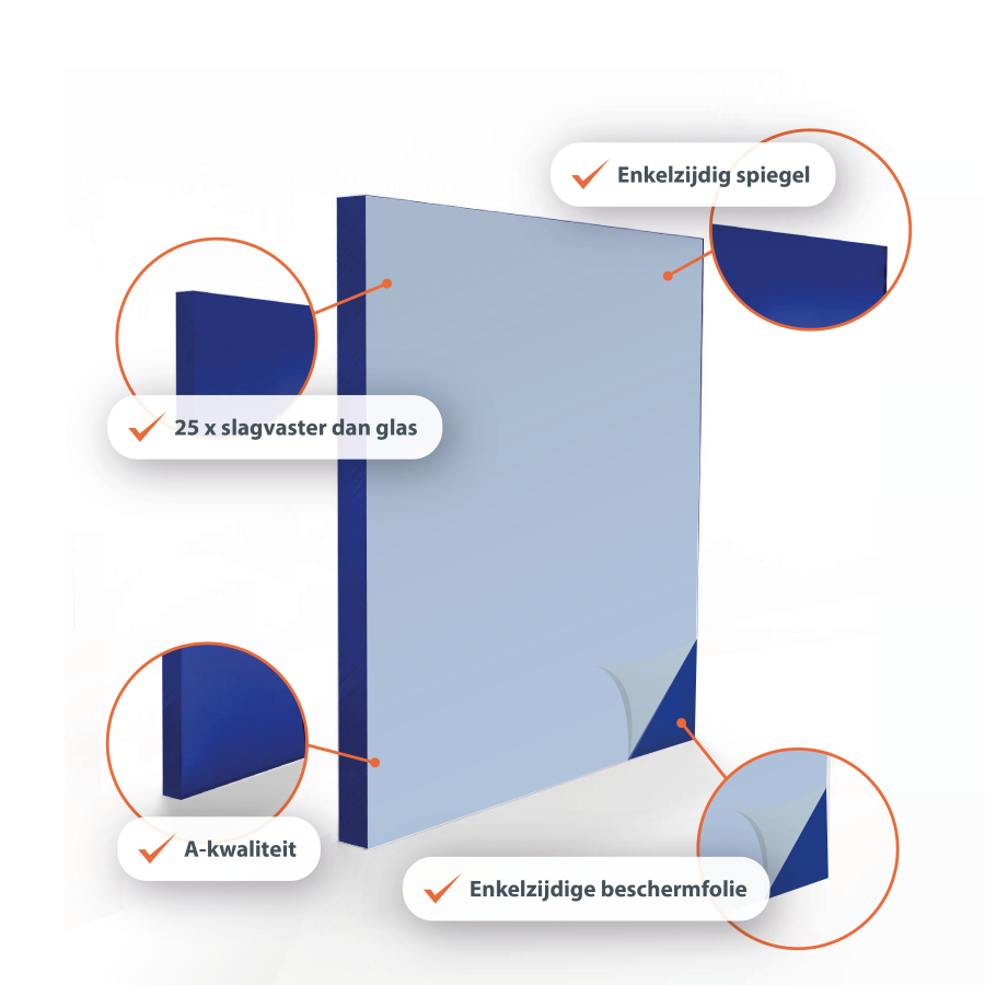 Acrylglas (Plexiglas®) Spiegel ist die leichte und bruchsichere Alternative zu Glas. Bis zu 25-mal schlagfester und nur halb so schwer wie Glas. Perfekt geeignet für Anwendungen, bei denen Gewicht oder Sicherheit eine Rolle spielen, zum Beispiel in Innenräumen oder für dekorative Projekte.
