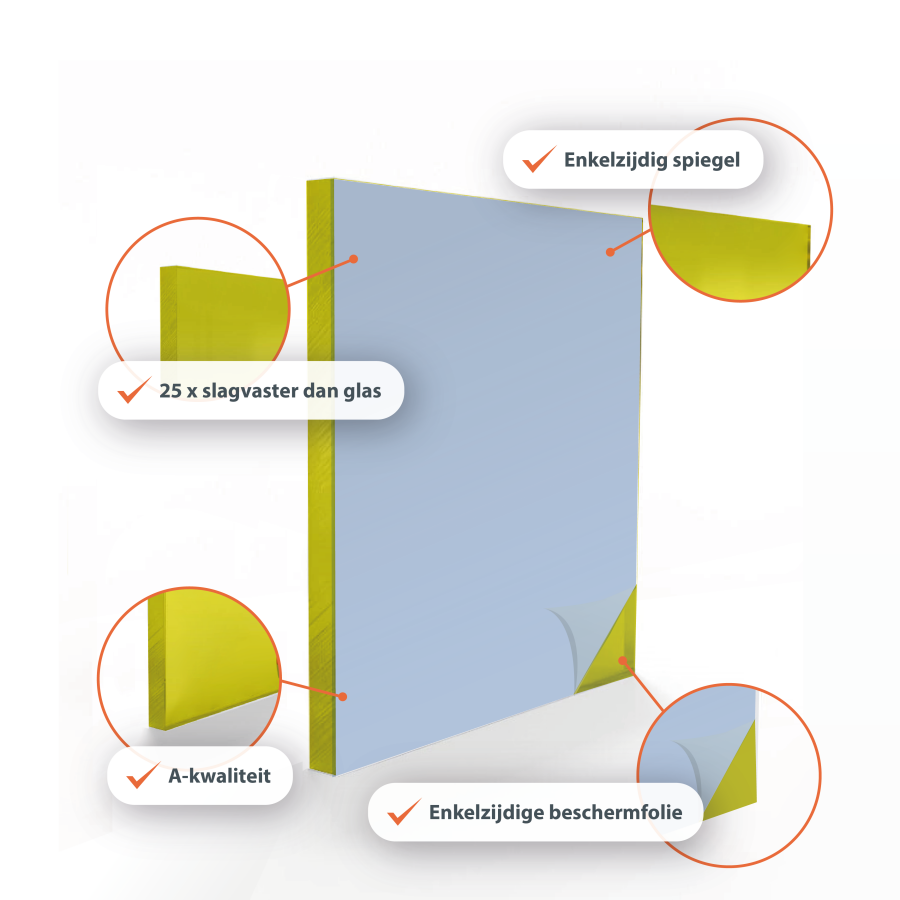 Acrylglas (Plexiglas®) Spiegel ist die leichte und bruchsichere Alternative zu Glas. Bis zu 25-mal schlagfester und nur halb so schwer wie Glas. Perfekt geeignet für Anwendungen, bei denen Gewicht oder Sicherheit eine Rolle spielen, zum Beispiel in Innenräumen oder für dekorative Projekte.