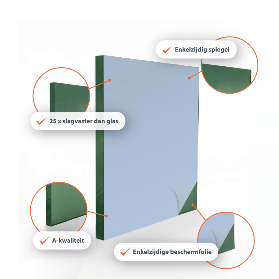 Acrylglas (Plexiglas®) Spiegel ist die leichte und bruchsichere Alternative zu Glas. Bis zu 25-mal schlagfester und nur halb so schwer wie Glas. Perfekt geeignet für Anwendungen, bei denen Gewicht oder Sicherheit eine Rolle spielen, zum Beispiel in Innenräumen oder für dekorative Projekte.