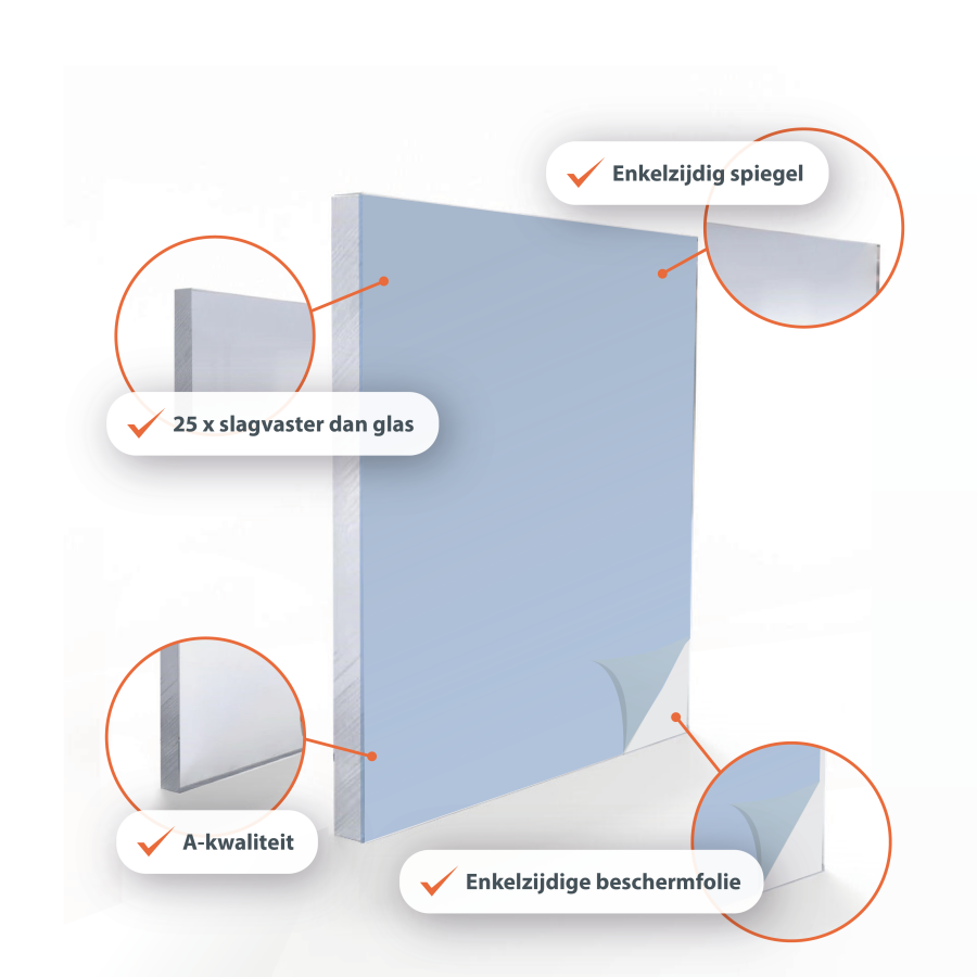 Acrylglas (Plexiglas®) Spiegel ist die leichte und bruchsichere Alternative zu Glas. Bis zu 25-mal schlagfester und nur halb so schwer wie Glas. Perfekt geeignet für Anwendungen, bei denen Gewicht oder Sicherheit eine Rolle spielen, zum Beispiel in Innenräumen oder für dekorative Projekte.